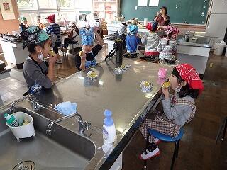 他の学年でも、収穫したサツマイモをスイートポテトや味噌汁の材料にしたりしておいしくいただきました。また、給食の材料としても使われ、味噌汁として全員でいただきました。