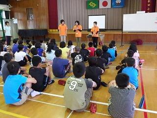 9月29日(金)に、新富町地域包括支援センターの方を講師としてお招きし、5・6年生の子ども達が認知症サポーター養成講座を受講しました。講座では、これからの県や町の人口の構成から高齢化が進むことや、若い世代が少ない人数で高齢者を支えていく社会となっていくことの説明を受け、これから避けて通れない認知症の症状や対応方法、認知症を防ぐための手遊びやボールを使ったゲームなどを教えていただきました。