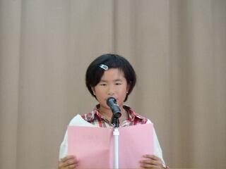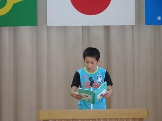 子ども達の作文発表では、1・3・5年の代表の子どもが、「休まずに登校したこと」「読みがたり」「委員会活動」など1学期に頑張ったことや、2学期に向けての課題などをステージの上で発表しました。