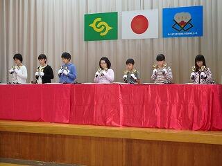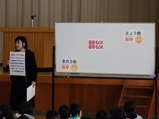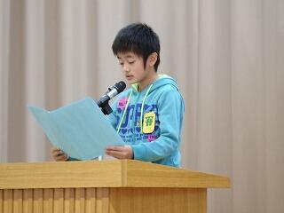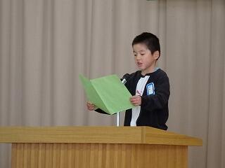 子ども達の作文発表では、2・4・6年生の代表の子どもが、3学期に努力していきたいことをステージの上で発表しました。