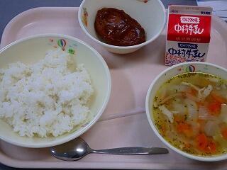 1月21日の給食は、麦ごはん、牛乳、、煮込みハンバーグ、コーンスープでした。