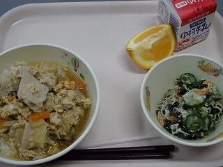 1月29日の給食は、麦ごはん、他人丼、鳥とキュウリのごま酢あえ、いよかんでした。