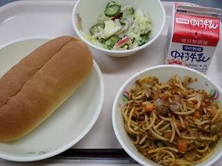 2月1日の給食は、ドックパン、牛乳、ミートスパゲッティ、リンゴサラダでした。