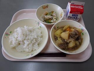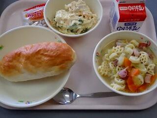 2月3日の給食は、米粉パン、牛乳、野菜のスープ煮、ポテトサラダでした。