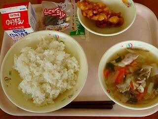 1月15日の給食は、麦ごはん、牛乳、鳥のバーベキューソース、みそ汁でした。