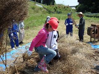 子ども達が地域や保護者の方と楽しい時間を過ごすことで、子ども達が周りの大人の人に守られているという安心感をもつことができるとともに、地域や保護者の方に、学校や子ども達の様子を知っていただくことをねらいとした「ふれあいタイム」では、「イートン田んぼ」で栽培した米の稲わらを使った縄作り体験(5年生)や、「イートン畑」で栽培したサツマイモのツルを使ったリース作り(4年生)など、地域や保護者の方と一緒に楽しい時間を過ごしました。リース作りに参加した学校関係者委員の方は、「子どもも楽しむ。親も楽しむ。そういうことが心の成長につながるし、思い出になると思う。」と話していました。