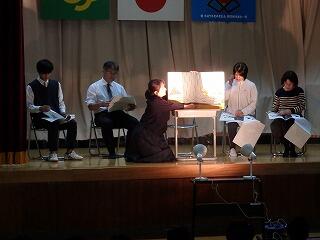 12月7日(水)の朝の時間に、放送委員会による委員会集会を行いました。活動内容の紹介では、朝のボランティア活動終了を知らせる放送を劇仕立てで紹介したり、給食時間の放送内容(今日の献立、今日の一口メモ、前日の残食調べの結果、今日の出来事、ハッピーバースデー)を紹介したりしました。また、給食時間の放送を聞く態度についても、劇を通して全校の子ども達で考えました。