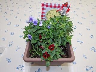 玄関に飾ってある花たちの朝の様子です。朝つゆが朝日に輝き、花びらをよりいっそう鮮やかに見せていました。