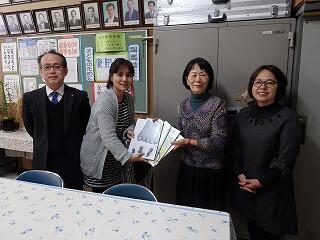 手作り絵本の寄贈の様子(「そらつくどん」の方と学校職員)