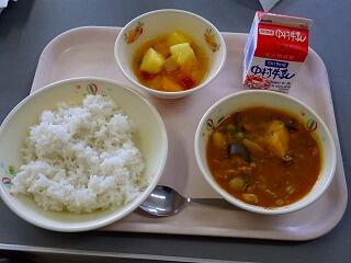 今日の給食は、麦ごはん、牛乳、新富産夏野菜カレー、フルーツパンチでした。新富産の野菜はやっぱりおいしいですね。