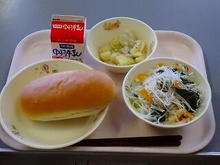 12月2日(水)の給食は、コッペパン、牛乳、ウインナーとキャベツのスープ、スイートポテトのサラダでした。おいもがとても甘かったです。