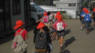 お母さん方の見送りを受けて5年生24名は元気に出発しました。
