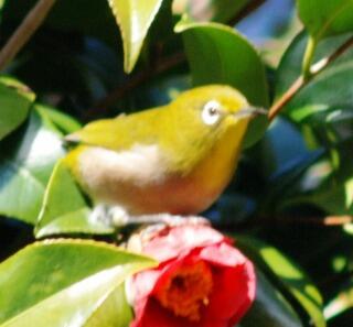 東畦原の黒澤さんの自宅のツバキにメジロがやって来ました。上新田小にも早く来てください。