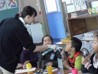 学校歯科医院から歯科衛生士さんが来られて、歯磨き指導をしていただきました。プロの指導で子ども達の歯磨きはメキメキと上達したはずです。