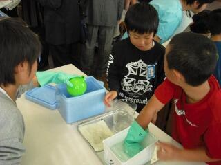 フラスコの口につけたシャボンが、お湯に付けるとどうなるかを調べます。興味津々です。