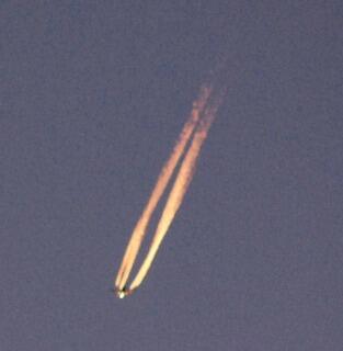 西の空にオレンジ色の光る物体発見 この写真は黒澤さんが11月19日 夕がた5時17分に学校から西の空に向けて撮影したものです。光る物体の正体は飛行機です。飛行機雲が光るとオレンジ色に輝くこともあるのですね。