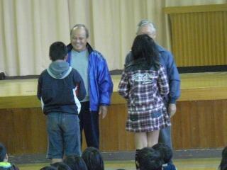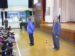 菜の花プロジェクトの河野さん・原田さんが学校に来られ、菜の花の種で作った菜種油を10本学校にくださいました。 写真は菜の花作りの話をする河野さん原田さんです。