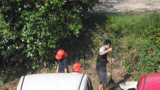 校舎の入口にいたカマキリを1年生が発見 つかまえて庭木の方にやさしく逃がしてあげました。