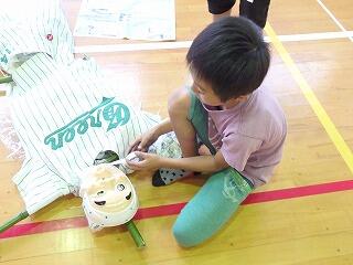 9月28日(木)に、5年生の子ども達が講堂でかかしを作り、イートン田んぼに設置しました。このかかしは、竹を切り出し、針金やひもでしばって骨組みを作り、子ども達が家から持ってきた材料(いらなくなった服、ひょっとこのお面、麦わら帽子など)を使って作りました。