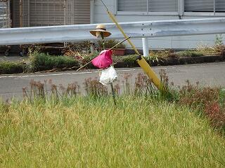 9月29日(木)に、5年生の子ども達が、イートン田んぼにかかしを設置しました。写真を見ていただければ分かりますが、なかなかの力作のかかしです。