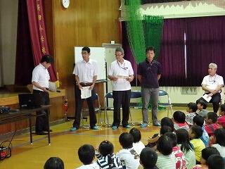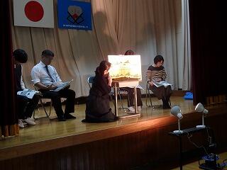 発表では、まず、学校紹介を行いました。「菜の花プロジェクト」や「座論梅の梅ちぎり体験」、運動会で披露する「棒踊り」等の紹介をしました。「棒踊り」は、実際にステージの上で踊りました。