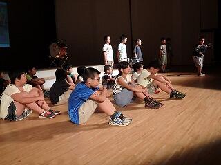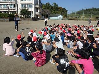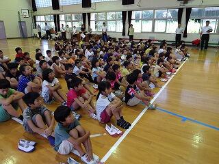 7月20日(水)に、体育委員会の子ども達による委員会集会が行われました。今回は、運動場のポイント作りや各学級へのボール配当などの体育委員会の活動を紹介した後、下半身を鍛える運動に全校児童で取り組みました。