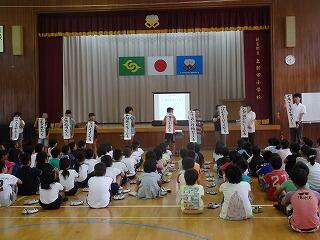 7月15日(金)の朝の時間に、3・4年生による音読集会を行いました。翌日の「しんとみ読みがたり」のリハーサルも兼ねていますので、参加する5年生子ども達6名も発表しました。発表の内容は、劇仕立ての「あいさつ団長」と、群読「かなしいときは」です。とても大きな声で、そして堂々とした態度で発表することができました。明日の本番が楽しみです。