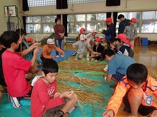 子ども達が地域や保護者の方と楽しい時間を過ごすことで、子ども達が周りの大人の人に守られているという安心感をもつことができるとともに、地域や保護者の方に、学校や子ども達の様子を知っていただくことをねらいとした「ふれあいタイム」では、「イートン田んぼ」で栽培した米の稲わらを使った縄作り体験(5年生)や、「イートン畑」で栽培したサツマイモのツルを使ったリース作り(4年生)など、地域や保護者の方と一緒に楽しい時間を過ごしました。リース作りに参加した学校関係者委員の方は、「子どもも楽しむ。親も楽しむ。そういうことが心の成長につながるし、思い出になると思う。」と話していました。