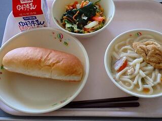 1月13日(水)の給食は、コッペパン、牛乳、きつねうどん、小松菜の和え物でした。