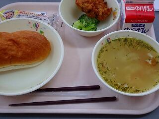 1月20日の給食は、米粉パン、牛乳、、鳥のカレーあげ、ブロッコリー、コーンスープ、米粉ドッグでした。