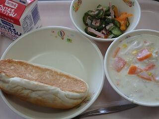 1月25日の給食は、米粉パン、牛乳、、クリームシチュー、ハムマリネでした。