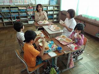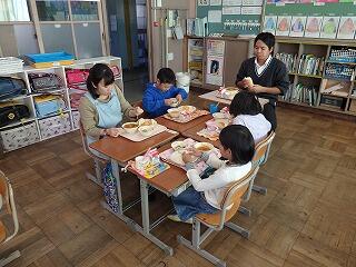 11月9日(水)に、1年生のふれあい給食を行いました。給食室の調理員さんや職員が子ども達のグループに入り、楽しくおしゃべりをしながら給食を食べました。この日のメニューは、野菜のミートソースとハムマリネでした。野菜のミートソースは、大きくカットされたジャガイモやカボチャがホクホクしていて、とてもおいしくいただきました。