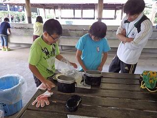 1日目は、古代火起こし体験とカレー作りを行いました。なかなか火起こしがうまくいきませんでしたが、全ての班がなんとか火を起こすことができました。カレーは、野外炊飯で作ったとは思えないほど、おいしくできあがりました。