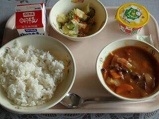 11月26日(木)の給食は、麦ごはん、牛乳、もみじ団子汁、クーブイリチーでした。