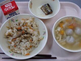 10月29日(木)の給食は、麦ごはん、牛乳、イワシのおかか煮、いもっこ汁、ふりかけでした。