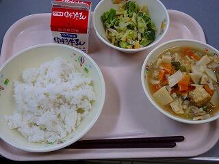今日の給食は、麦ごはん、牛乳、厚揚げの中華煮、胡麻ドレッシングサラダでした。