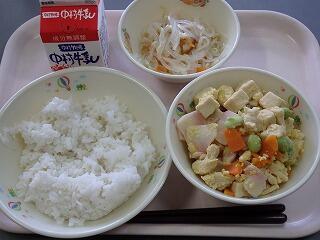 10月1日(木)の給食は、麦ごはん、牛乳、高野豆腐の卵とじ、ちくわの酢の物でした。高野豆腐に味がしみおいしかったです。