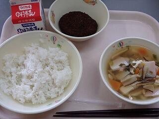 10月2日(金)の給食は、麦ごはん、牛乳、コロッケ、もやし、すまし汁でした。久しぶりのコロッケでした。