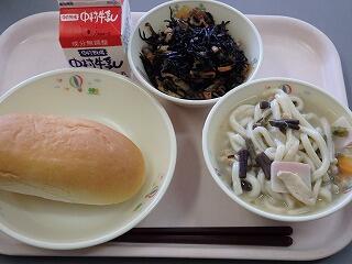 10月7日(水)の給食は、コッペパン、牛乳、山菜うどん、ひじきの油炒めでした。