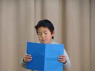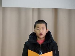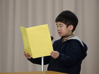 子ども達の作文発表では、1・3年の代表の子どもが、「運動会で花電車の係の仕事をしたこと」「持久走大会で最後まで走り抜くことができたこと」など2学期に頑張ったことや、「ひき算を頑張ること」「給食を残さないこと」など3学期に挑戦したいことをステージの上で発表しました。