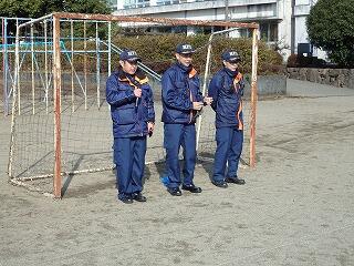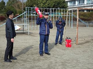 次に、一度教室に戻り、運動場への避難訓練です。今回は、給食室からの出火で、しかも火災により校内放送が使えないという状況を想定しての訓練でしたが、昨年度の訓練よりも約40秒短い時間で避難することができました。子ども達がより真剣に取り組んだことが分かります。その後、水消火器による消火訓練も行いました。