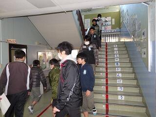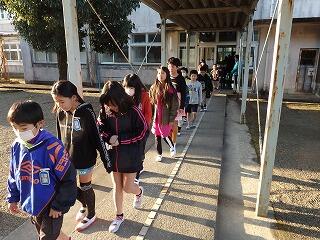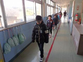 1月24日(水)の朝の時間を活用して、ミサイル対応の避難訓練を行いました。今回は、Jアラートのメッセージ音と避難を呼びかける放送の後、学年ごとに次の3か所に避難しました。