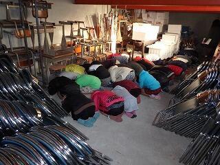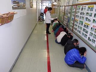 上記の避難場所は、本校の校舎内で「丈夫な壁がある」「窓ガラスが少ない」等の条件を考慮して設定したものです。避難場所では、壁の方に頭を向けてしゃがみ込み、できるだけ低い姿勢をとりました。