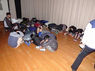5分間ほどその姿勢で待機した後、放送の合図で講堂に集まり、全体指導を行いました。具体的には、「ミサイル対応の避難訓練は、地震や火災の避難訓練と違い、屋内で長い時間、頭を守ってしゃがみ込むことが必要となること」「屋外でJアラートのメッセージが流れた場合には、近くの建物か地下に避難すること、建物がない時には物陰に身を隠すか地面に伏せて頭部を守ること」等を指導しました。