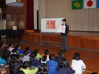 今年度も、1月19日(金)に町の税務課から講師をお招きして、6年生対象の租税教室を行いました。まず、「もし、税金がなかったら…」というテーマのDVDを鑑賞しました。信号もついていない、火事が起こっても消火することができない…という社会は、子ども達にとって税金の必要性を考えさせられるものでした。