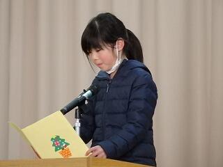 子ども達の作文発表では、1・3年の代表の子どもが、「運動会で花電車の係の仕事をしたこと」「持久走大会で最後まで走り抜くことができたこと」など2学期に頑張ったことや、「ひき算を頑張ること」「給食を残さないこと」など3学期に挑戦したいことをステージの上で発表しました。