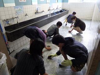 先日、5・6年生の美化委員会の子ども達の話合いの中で、「この校舎に感謝の気持ちを伝えるために、普段の掃除時間にはなかなかできないところをきれいにしよう!」という意見が出ました。話合いの結果、普段は立ち入ることができない階段4階部分(屋上への出入り口)をきれいにしたり、2階の手洗い場の床をたわしでゴシゴシと磨いたりする活動を行いました。