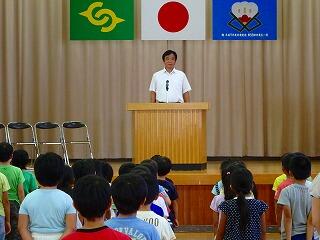 校長先生は特に「あいさつ」の大切さをお話しされました。夏休み中もすすんで笑顔であいさつを頑張りましょうと子どもたちにお話しされました。最後は「夏休みこんなことを頑張りました。とたくさんのお話を聞かせてください。みんな元気に2学期に会いましょう。」と締めくくられました。