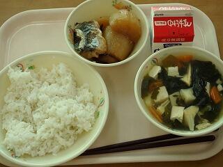 10月16日(金)の給食は、麦ごはん、牛乳、さばと大根の照り煮、五目豆腐スープした。大根によく味がしみていました。