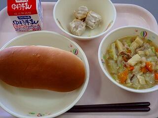 10月19日(月)の給食は、黒糖パン、牛乳、八宝菜、蒸しシューマイでした。